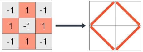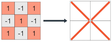 অর্থাৎ এখন থেকে কম্পিউটার ভেবে নিবে যে বাম পাশের 3x3 পিক্সেলের যে ফটো সেটারই একটা সিমপ্লিফায়েড ভার্সন হচ্ছে ডান পাশের 2x2 পিক্সেলের ইমেজ যেটা কিনা কিছু \ / (সেই অংশ বা অঙ্গ যাই বলেন) এরসমন্বয়।