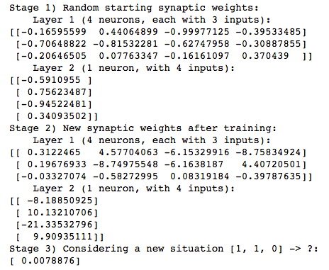 print ("Stage 3) Considering a new situation [1, 1, 0] -> ?: ")