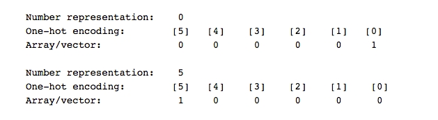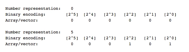এই টিউটোরিয়ালে আমরা ভ্যালিডেশন সেটের ব্যবহার করবো না। যা হোক, Cell 2 এর কোডের read_data_sets মেথডের দ্বিতীয় প্যারামিটার নিয়ে একটু কথা বলি. one_hot=True পাঠিয়ে আমরা বলছি যে এই ডাটাসেট এর লেবেল (ফটোর সাপেক্ষে সঠিক উত্তর/ডিজিট) গুলোকে আমরা এই ফরম্যাটে চাই। এই ফরম্যাট ডেসিম্যাল ডিজিটের বাইনারি রিপ্রেজেন্টেশনের মতই কিন্তু একটু অন্যভাবে রিপ্রেজেন্ট করে। মাত্র একটি বিট কে হাই বা 1 করে সেই ডিজিটের অবস্থান প্রকাশ করা হয়। নিচের উদাহরণ দেখলেই ব্যাপারটি সহজেই বোঝা যাবে। যেমন 0 এবং 5 এর বাইনারি রিপ্রেজেন্টেশন হয় নিচের মত,